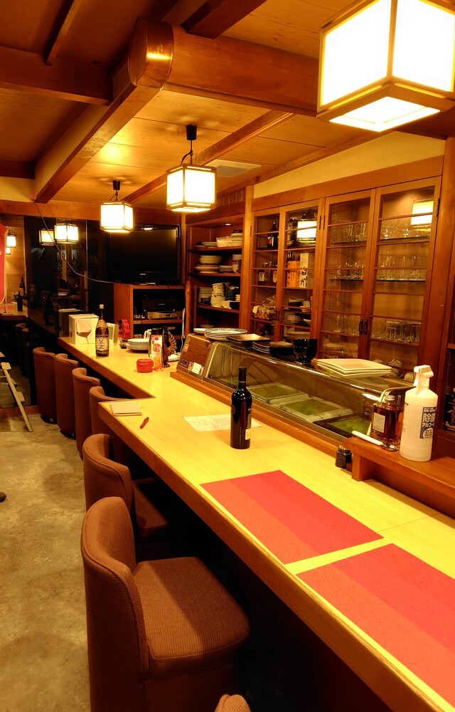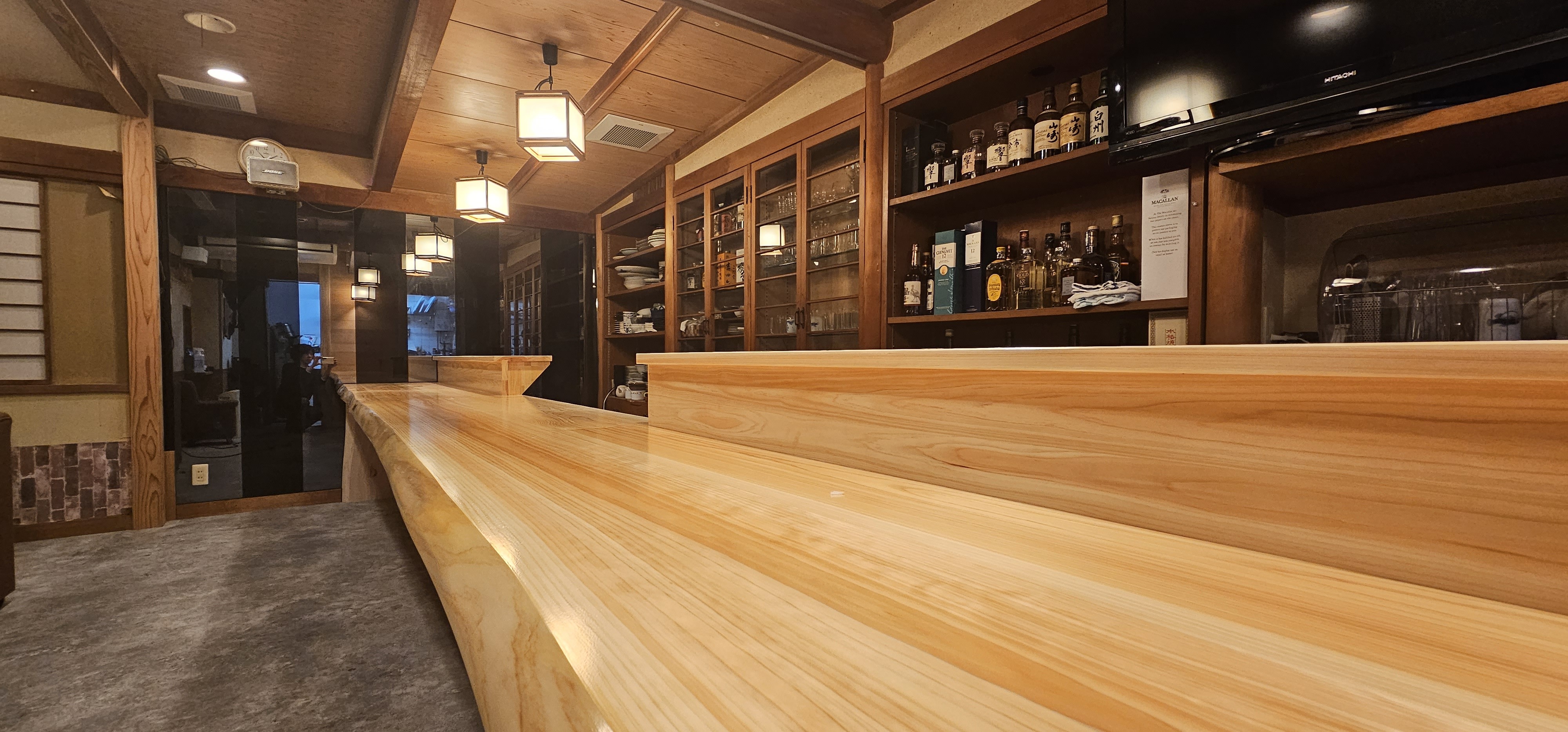 6mのカウンターはお店の顔といっていいほど目を引き、無垢板ならではの温かみと美しい木目が空間をより上質に引き立ててくれます。