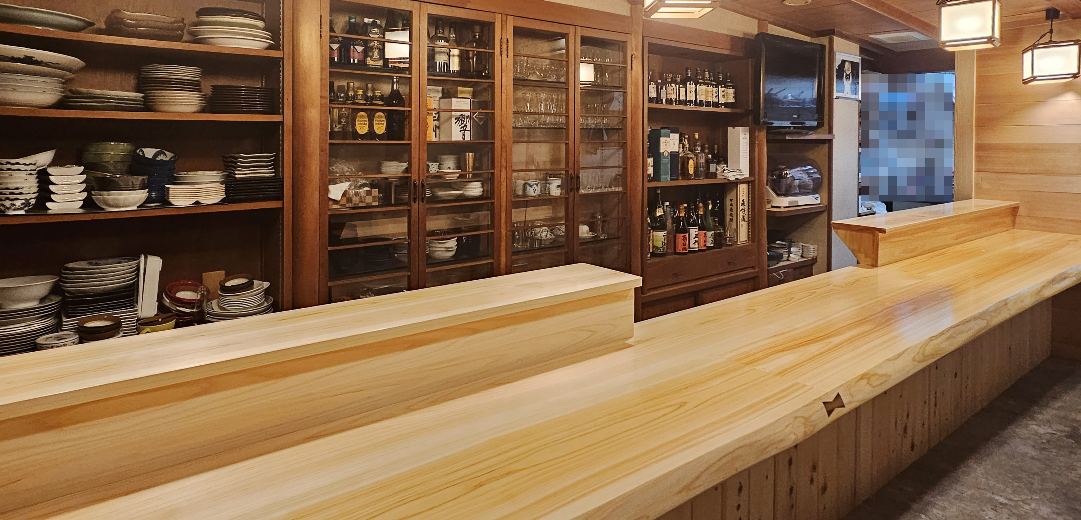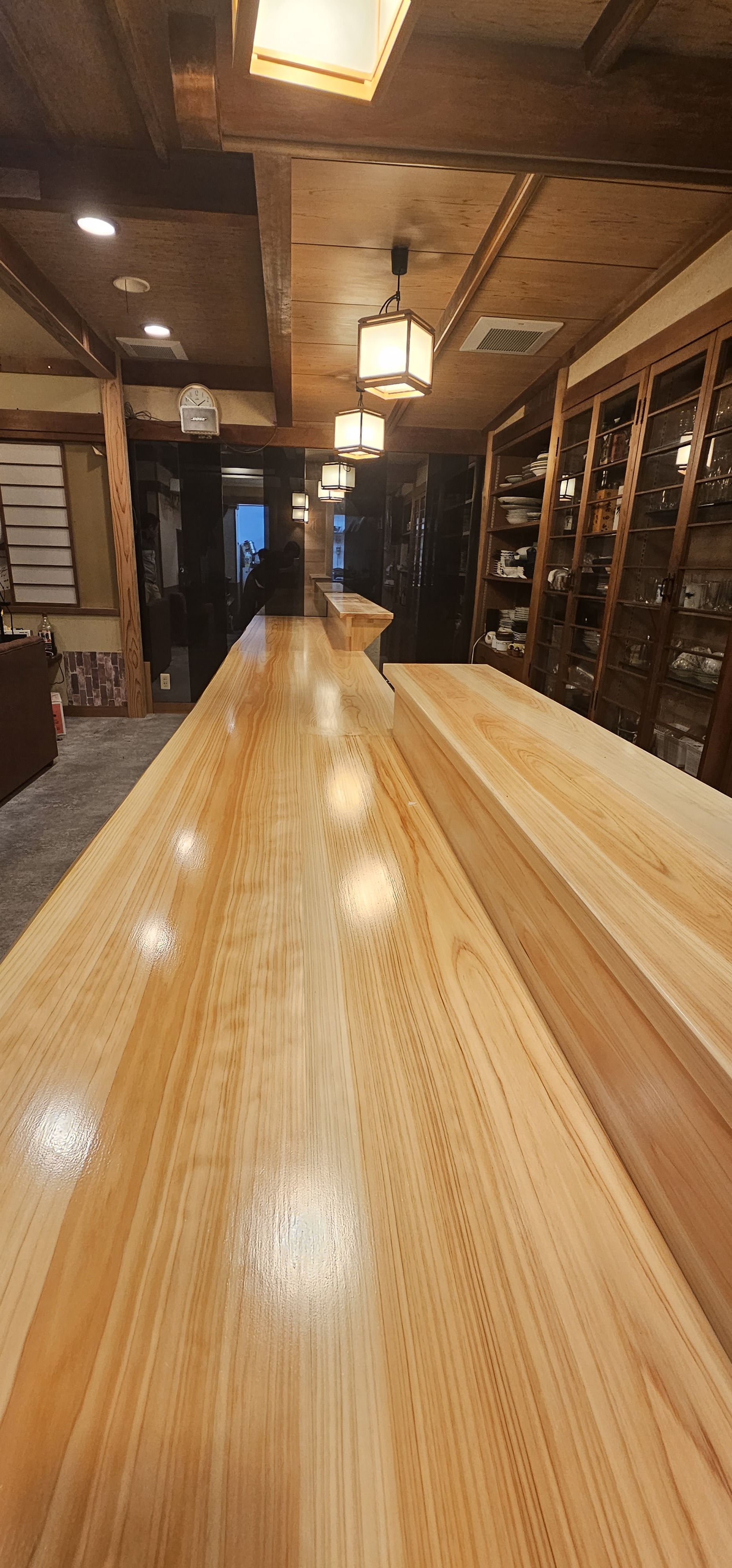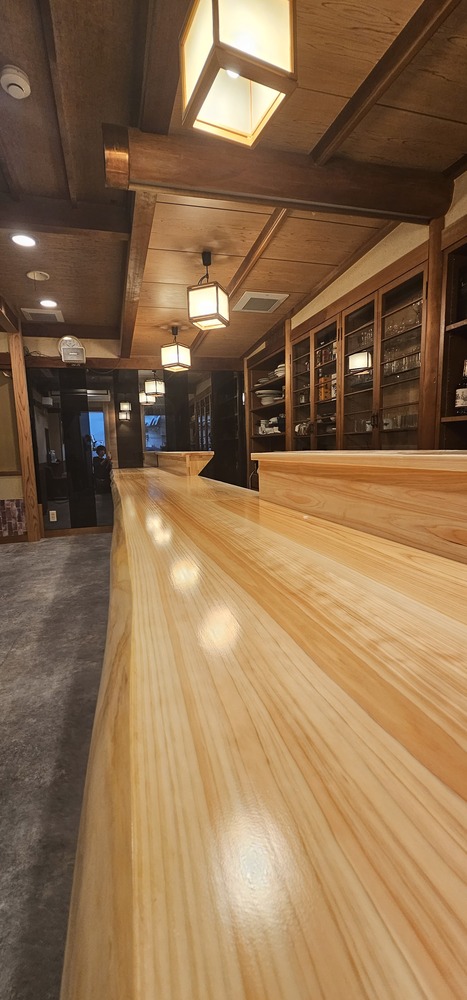 店舗入り口が狭いためヒノキの無垢板3枚を使い、それぞれを現場で丁寧に組み上げ、反りを抑える施工も施し一体感ある1枚のカウンターが完成しました。